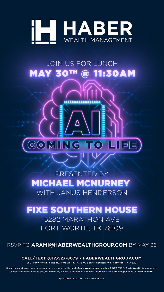 You're invited to a luncheon hosted by Haber Wealth Management, featuring Michael McNurney from Janus Henderson. Join us as we explore the transformative impact of artificial intelligence and its role in reshaping industries especially the world of finance.
