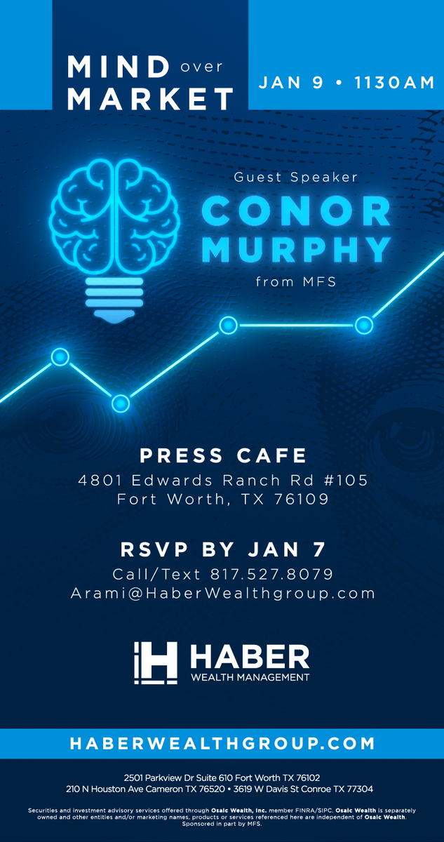 Haber Wealth is excited to invite you to our annual event, Year Ahead: Mind Over Market, hosted at Press Cafe. This year’s event will feature guest speaker Conor Murphy with MFS
