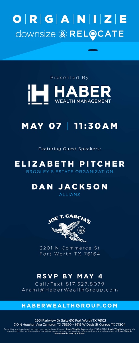 Haber Wealth is pleased to invite you to our upcoming luncheon, Organize, Downsize & Relocate, hosted at Joe T. Garcia’s. The event will feature guest speakers Elizabeth Pitcher of Brogley’s Estate Organization and Dan Jackson from Allianz.